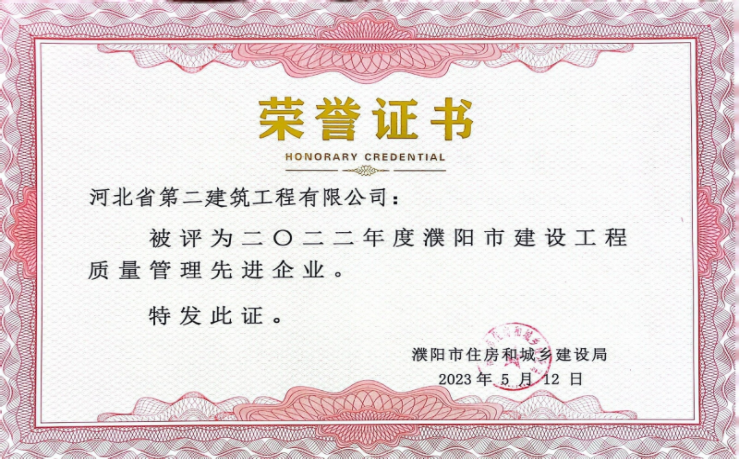 • 公司榮獲濮陽(yáng)市“2022年度建設工程質(zhì)量管理先進(jìn)企業(yè)”榮譽(yù)稱(chēng)號
