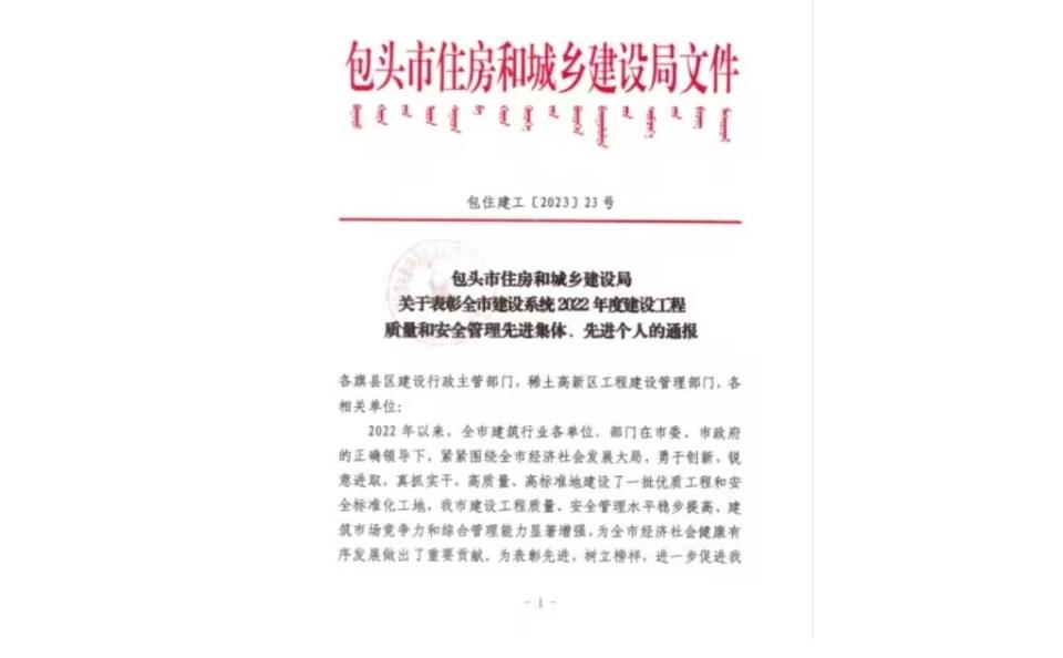 • 九分公司內蒙古農業(yè)大學(xué)項目榮獲包頭市“2022年度建設工程質(zhì)量和安全管理先進(jìn)集體”榮譽(yù)稱(chēng)號