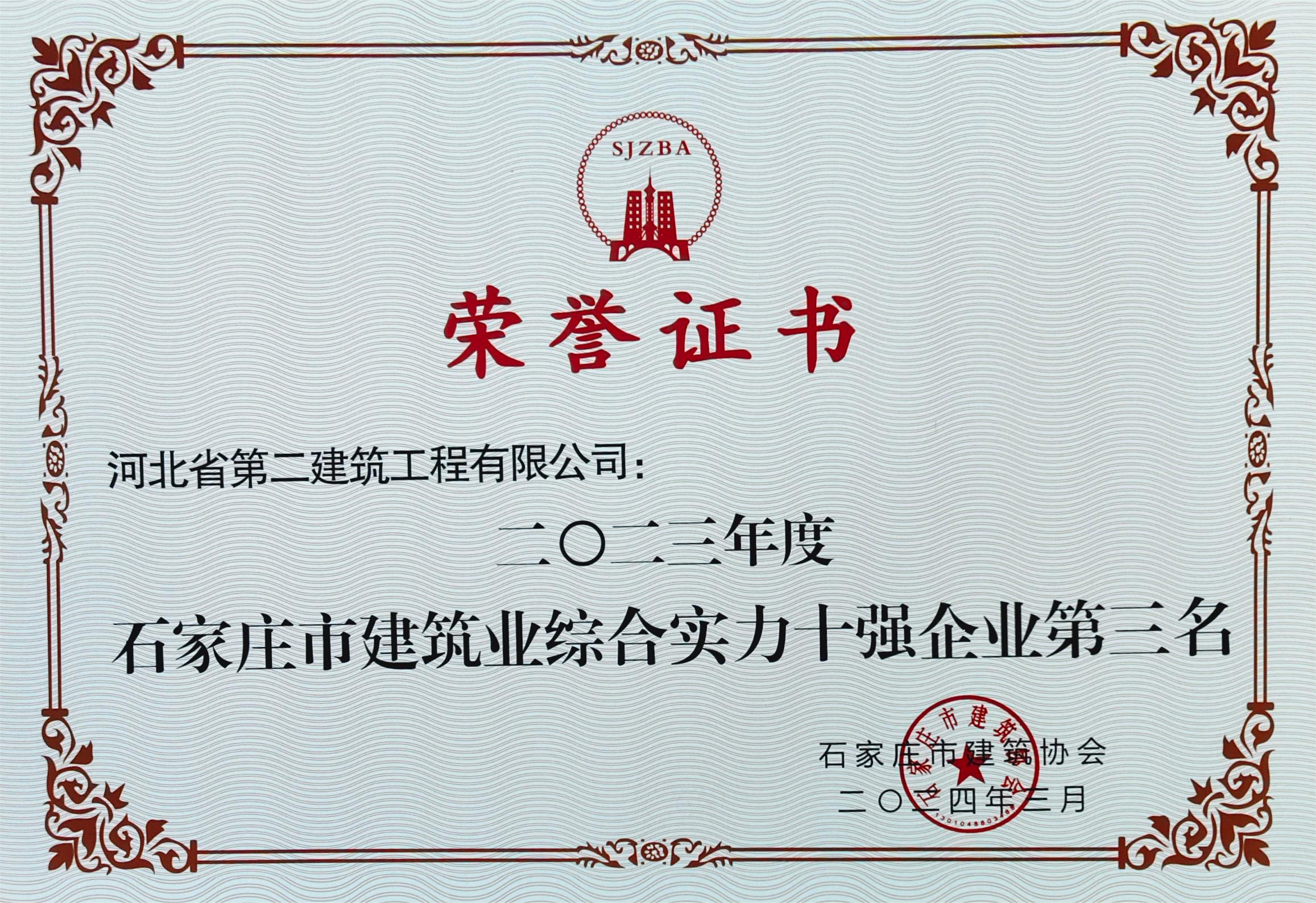 • 2023年度石家莊市建筑業(yè)綜合實(shí)力十強企業(yè)第三名