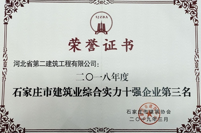 二0一八年度石家莊市建筑業(yè)綜合實(shí)力十強企業(yè)第三名