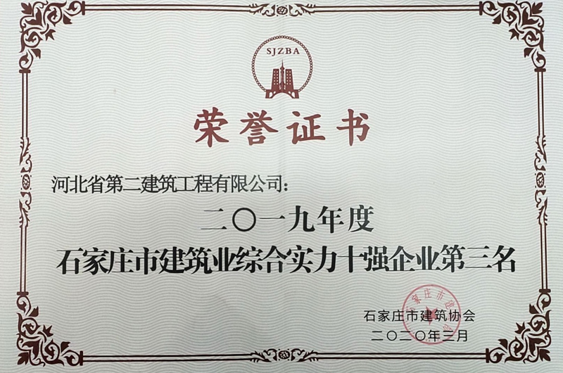 二0一九年度石家莊市建筑業(yè)綜合實(shí)力十強企業(yè)第三名