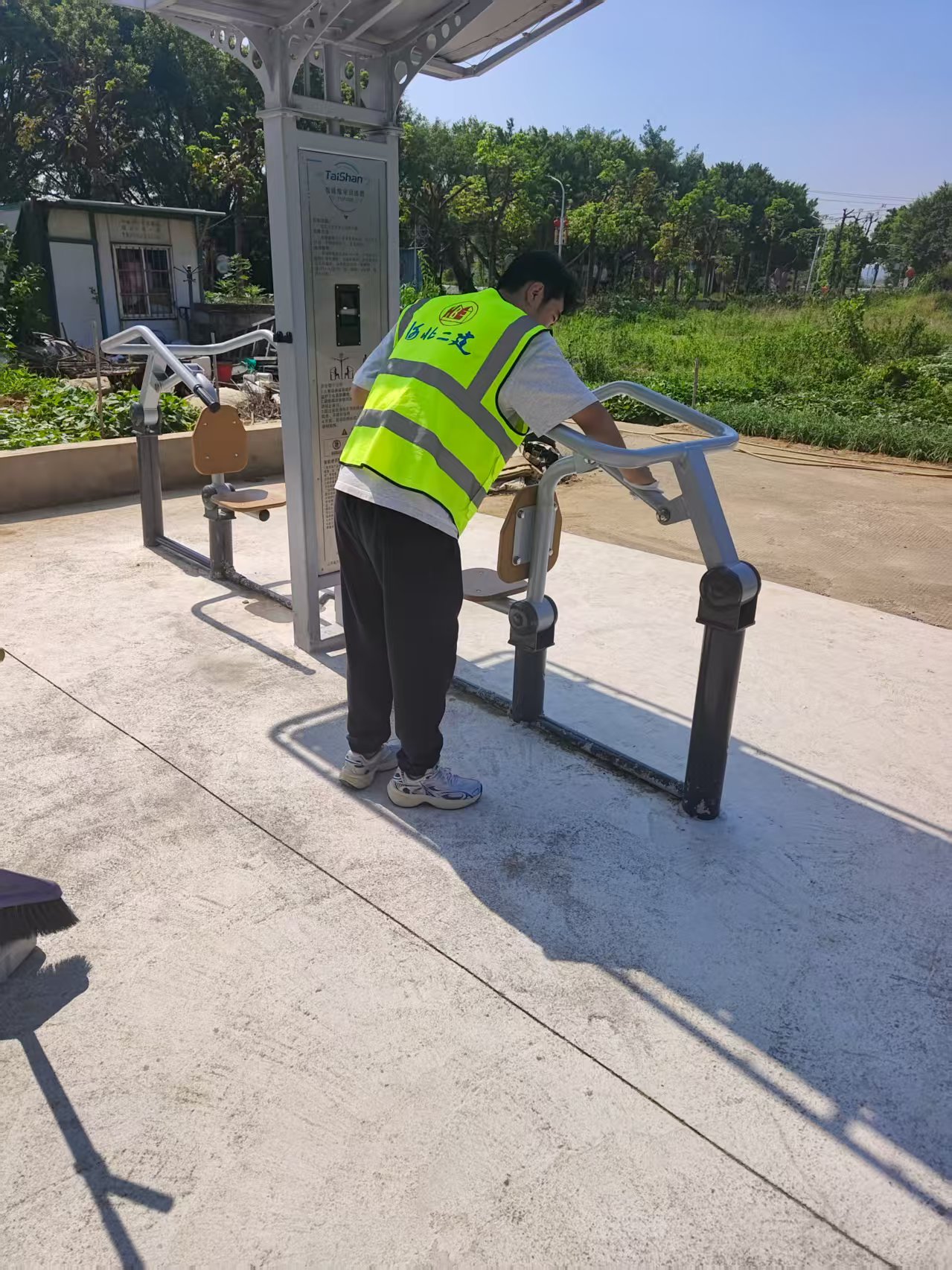 活動(dòng)當天,志愿者們早早避開(kāi)午后酷暑,攜帶提前精心準備的抹布、掃帚、垃圾袋等工具,迅速投入到志愿行動(dòng)中。在項目部的統籌安排下,大家分工明確、默契配合,形成了一股高效協(xié)作的志愿力量。一部分志愿者專(zhuān)注于公園內健身器材的清潔工作,夏日高溫多雨,器械表面易附著(zhù)汗漬與灰塵,他們仔細擦拭著(zhù)每一處扶手、每一個(gè)器械部件,不放過(guò)任何一個(gè)積灰的角落。經(jīng)過(guò)認真擦拭,原本蒙塵的健身器材煥然一新,重新煥發(fā)出干凈整潔的面貌,為傍晚健身、休閑的市民們提供了安全衛生的健身環(huán)境。